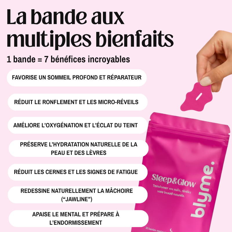 Le Blyme Sleep & Glow maintient délicatement vos lèvres fermées pendant la nuit, favorisant la respiration nasale plutôt que la respiration buccale.